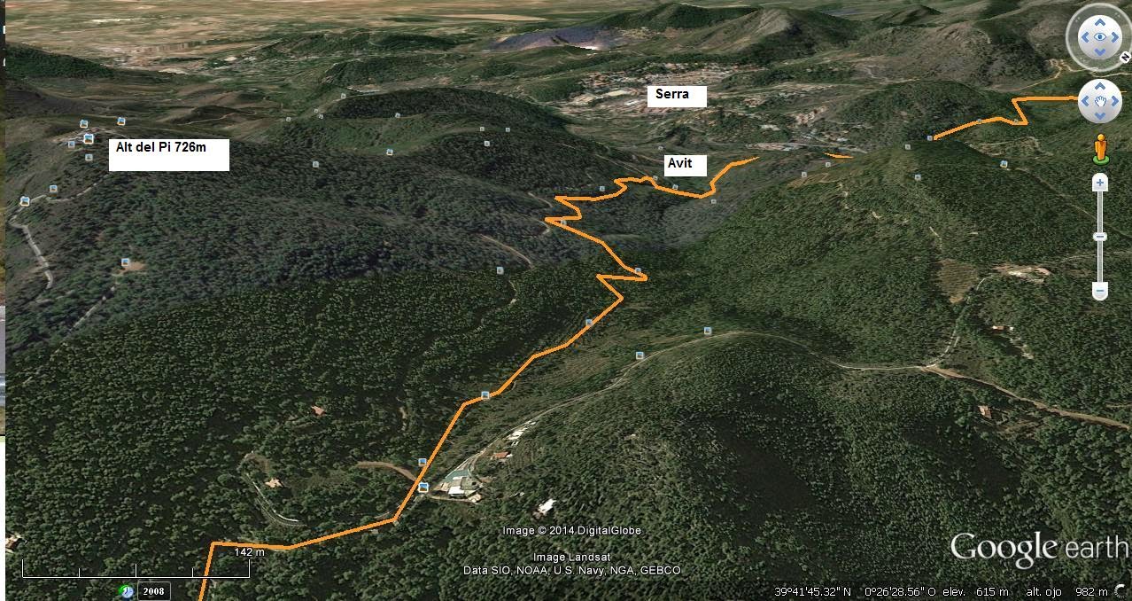 y más tarde de la Sierra de Espadán. Un rato después, aparece Les Rates, montaña que vamos a bordear por su parte izquierda según la miramos. Pero hay que bajar, para ello bajaremos -180m zigzagueando en los próximos 1800m En esta bajada llegaremos ya al km 30 de la carrera.